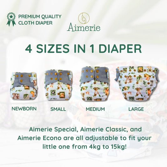 Aimerie cloth diapers are adjustable to fit babies from 4kg to 15kg (newborn up to 3 years old). With multiple snap settings and elastic adjustments, you can easily customize the fit as your baby grows—no need to buy different sizes!Click here to see how to adjust diaper size.